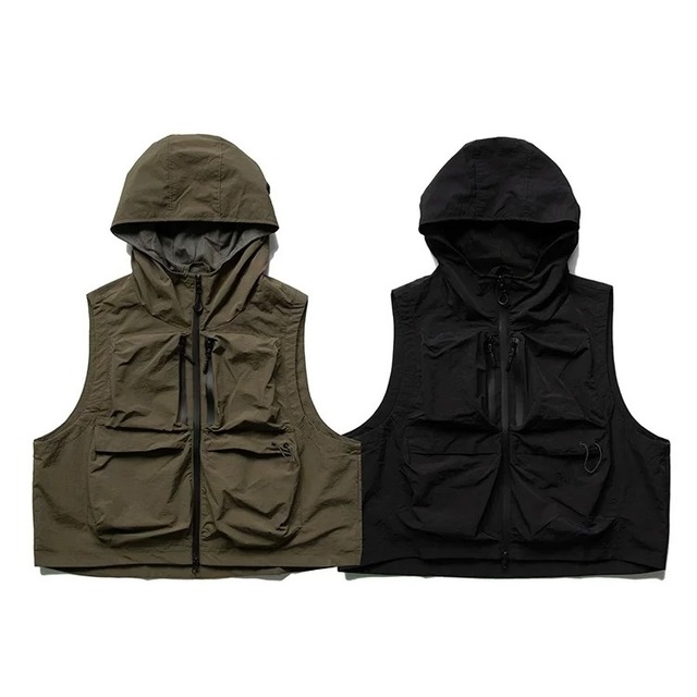 フロントジッパー付きナイロンショート丈フードベスト L00186
