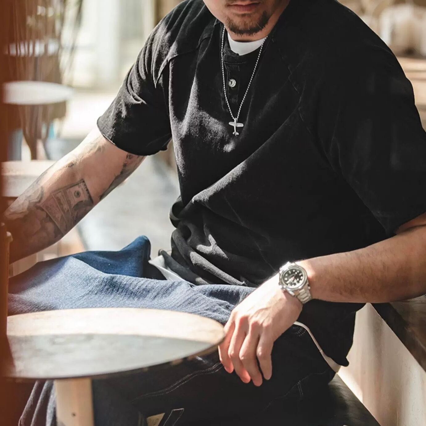 普段使いに最適なヘンリーネック半袖Tシャツ。