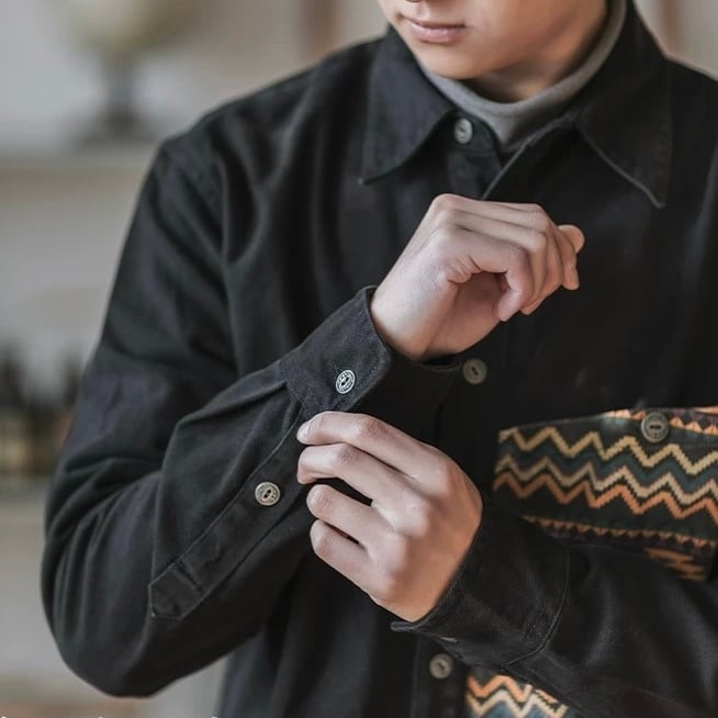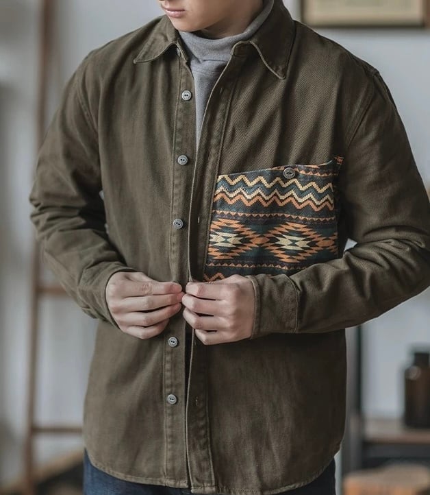 普段使いに最適なボタンダウンシャツです。シンプルながらも、パッチワークされた民族柄のポケットが、さりげないアクセントになっています。着心地の良い素材感で、リラックスしたスタイルを楽しめます。様々なボトムスと合わせやすく、デイリーユースに最適です。