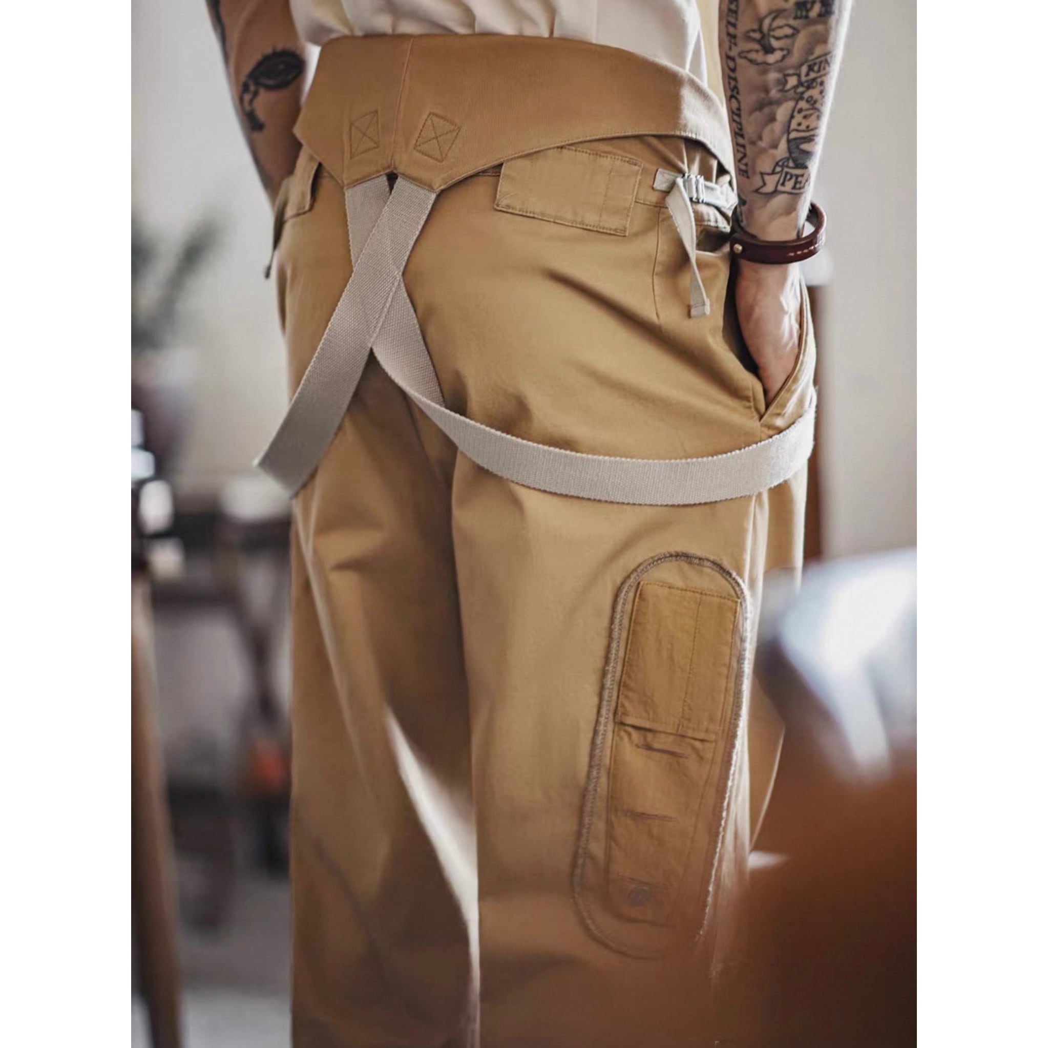 無骨なミリタリーデザインに、ストリートのエッセンスをプラスしたサスペンダー付きカーゴパンツ。厚みのあるコットンツイル素材で仕立て、タフな印象ながら動きやすさも両立。