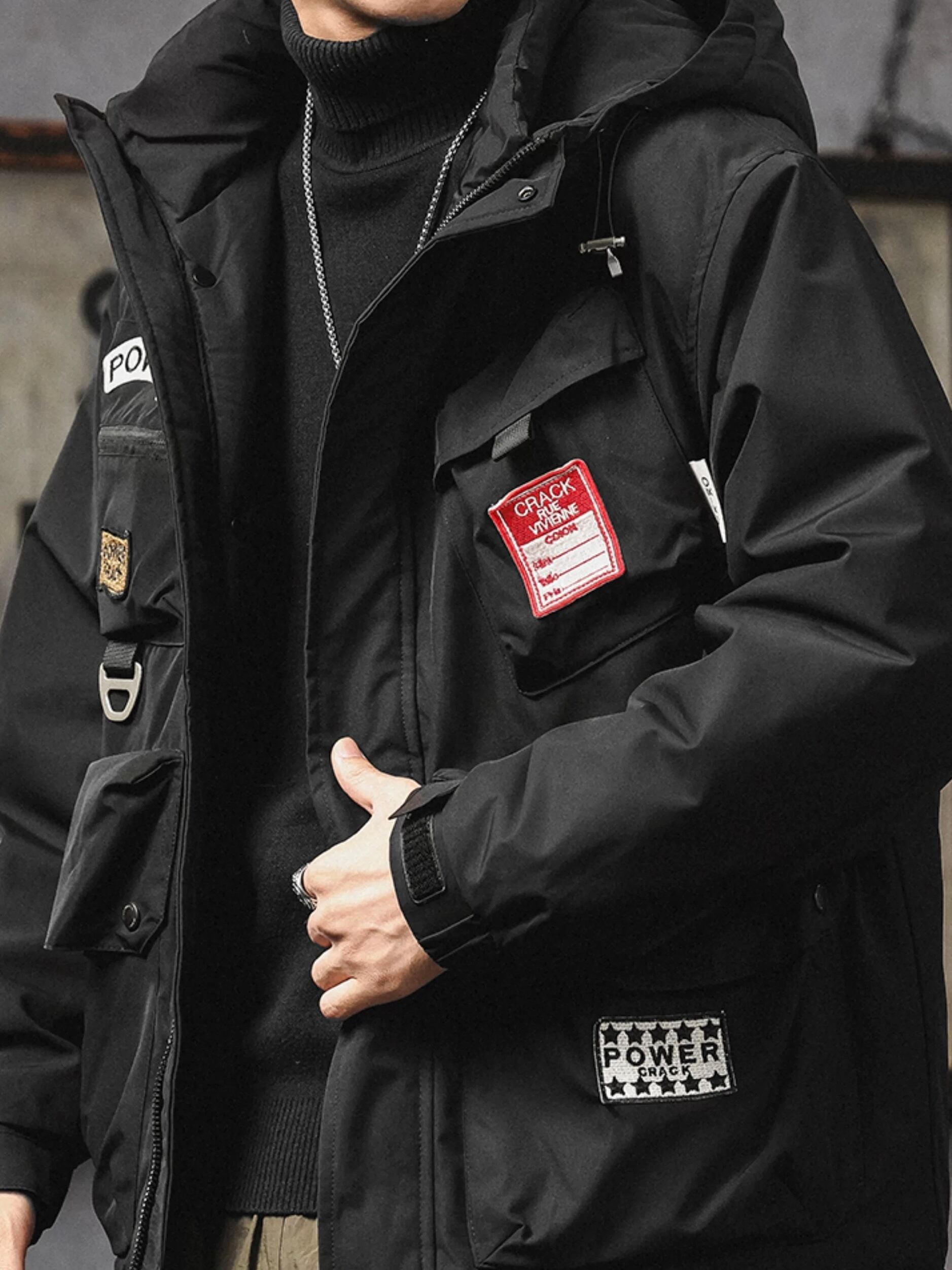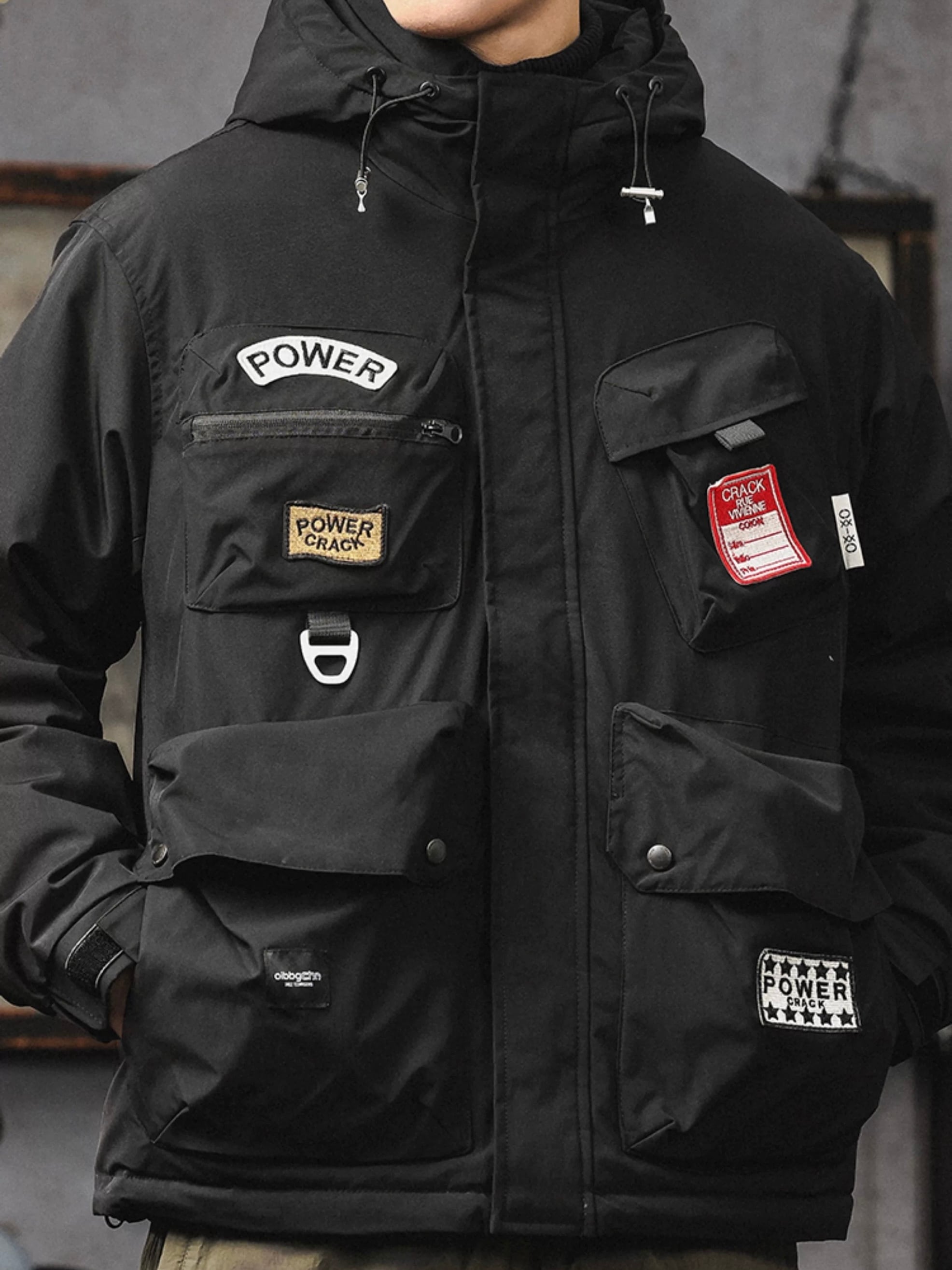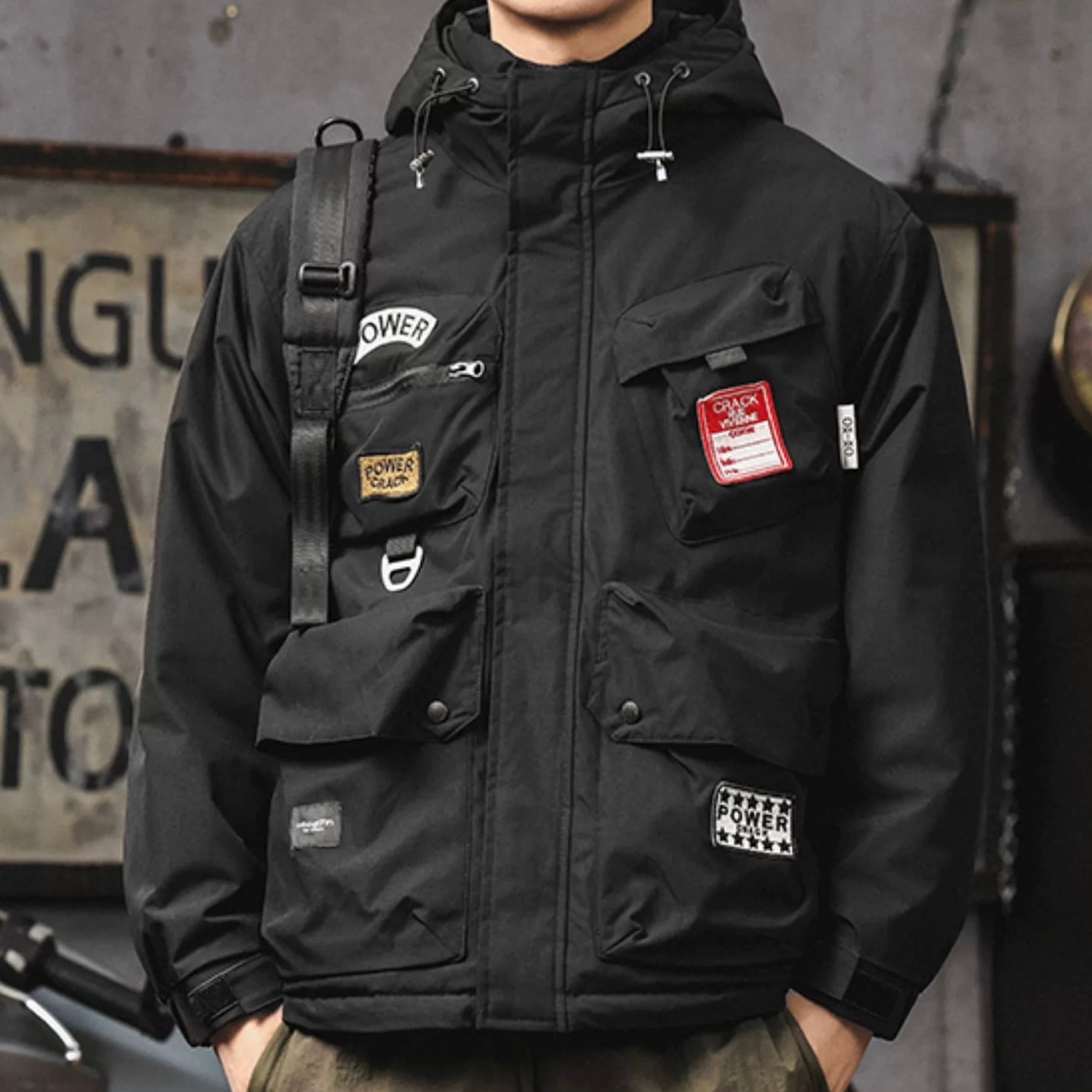 胸元とフロントに配置された多機能ポケットがデザインのアクセントとなり、ミリタリーギアのような雰囲気を漂わせます。