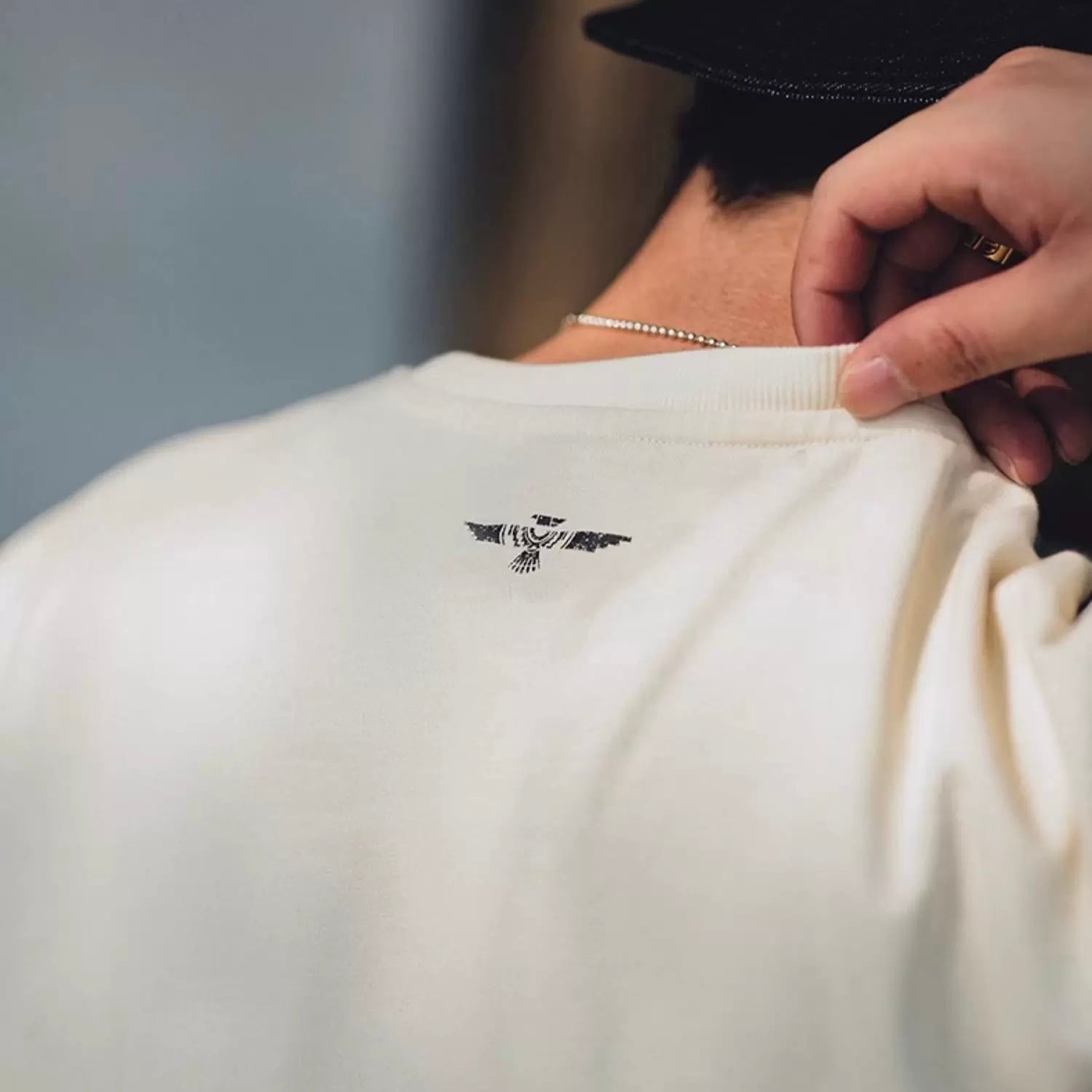 シンプルなデザインに個性をプラスする、フェザーネックプリントのショートスリーブTシャツ。
