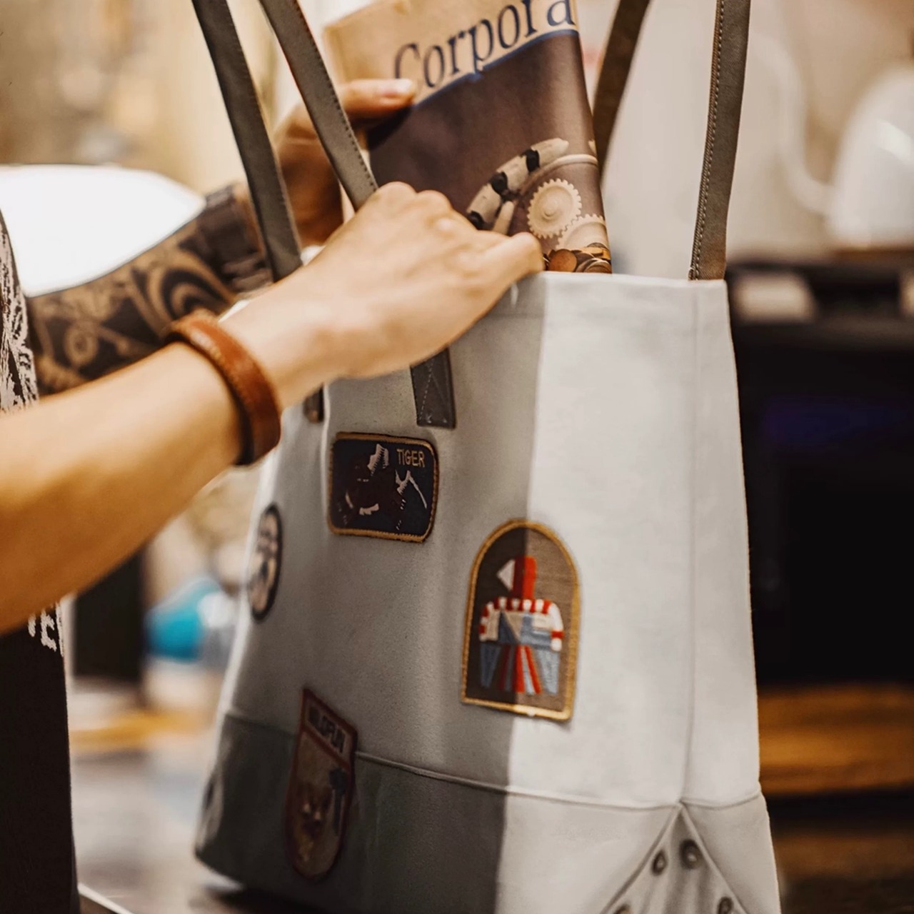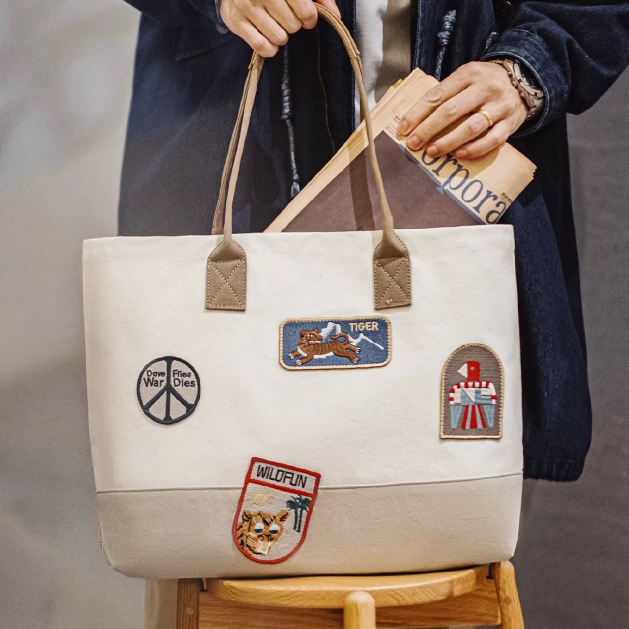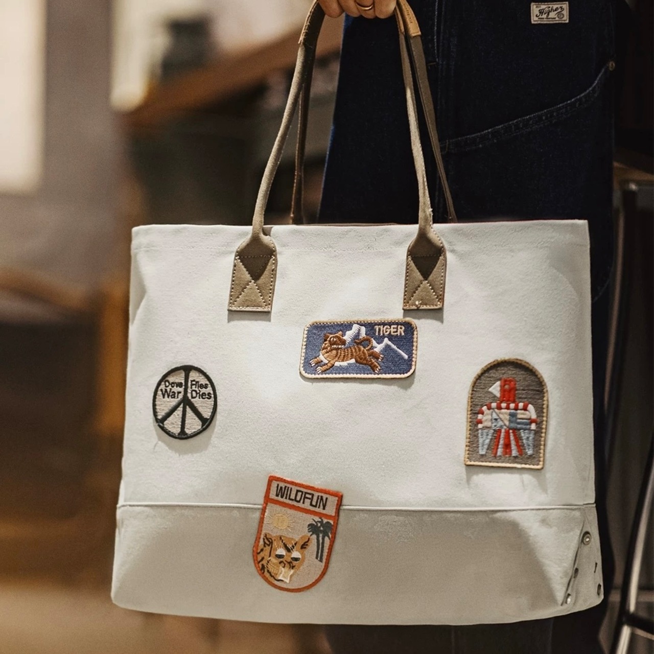 普段使いに最適なキャンバス地トートバッグ。パッチワークデザインとワッペンが個性を演出します。