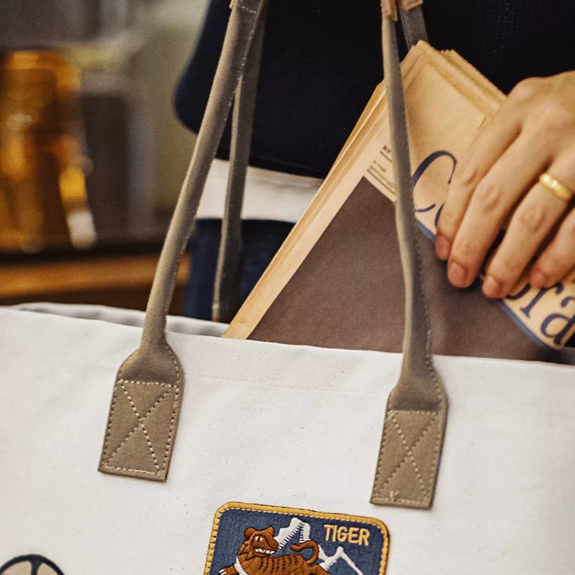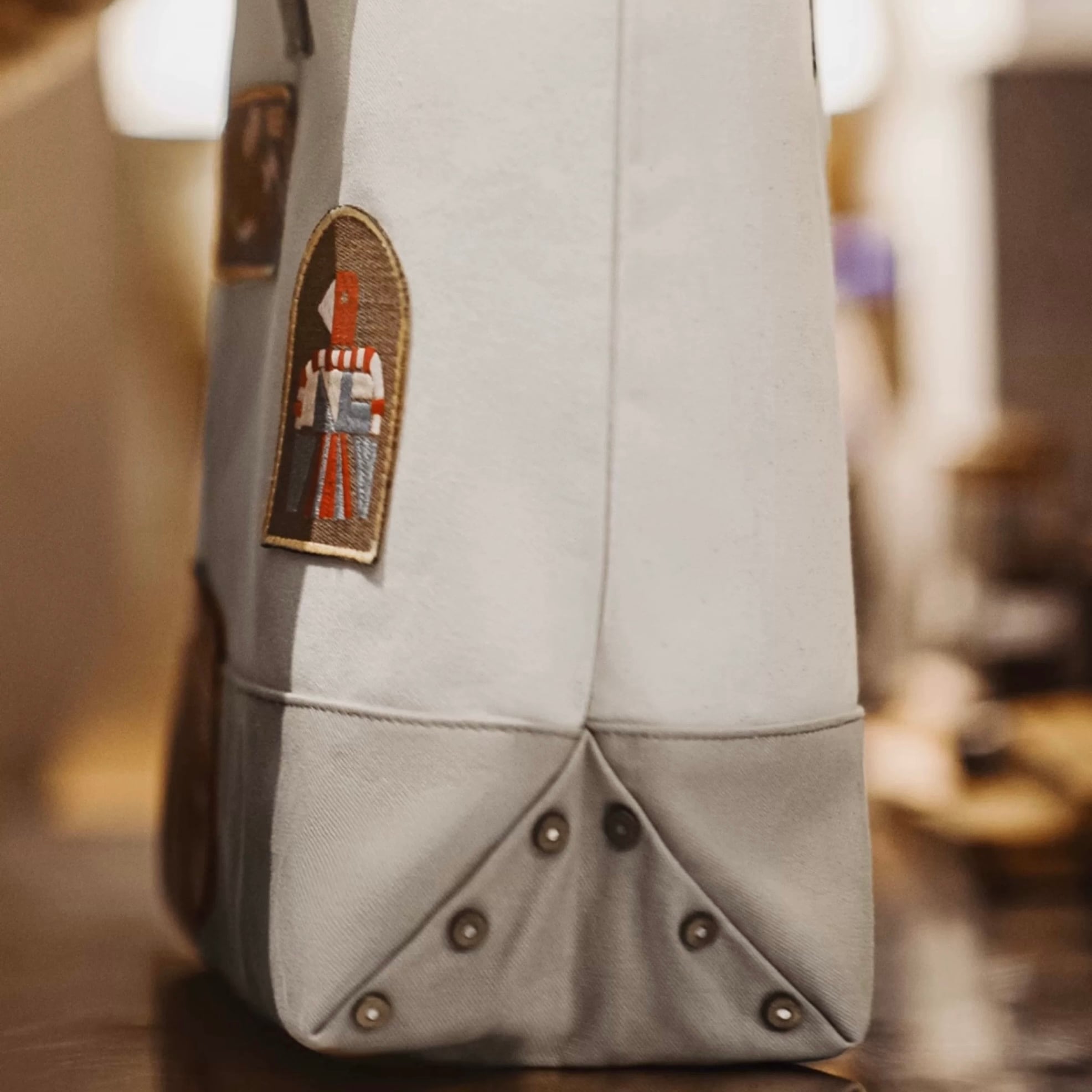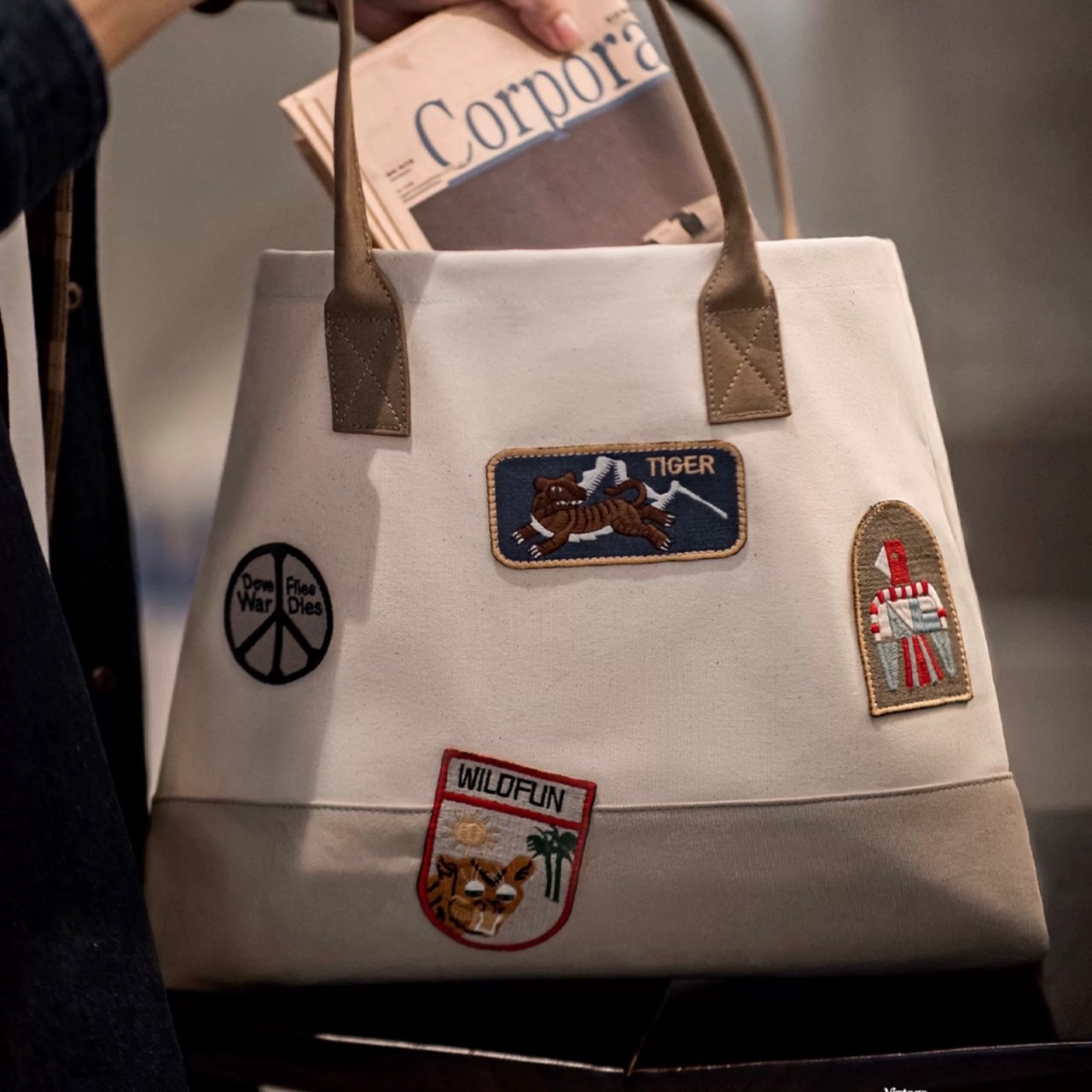 普段使いに最適なキャンバス地トートバッグ。パッチワークデザインとワッペンが個性を演出します。